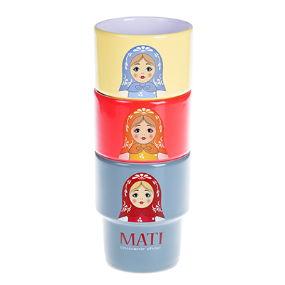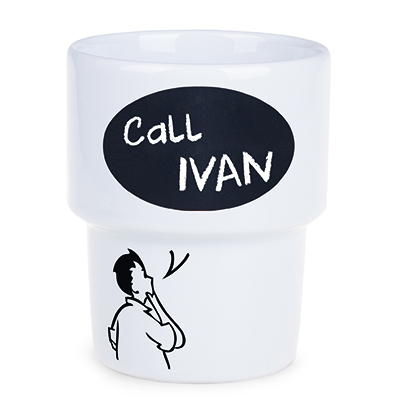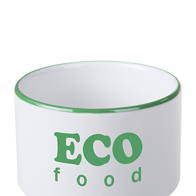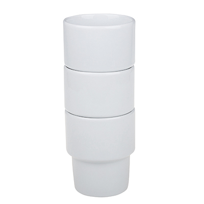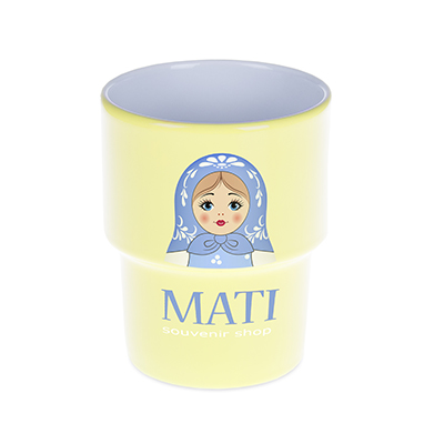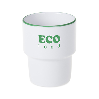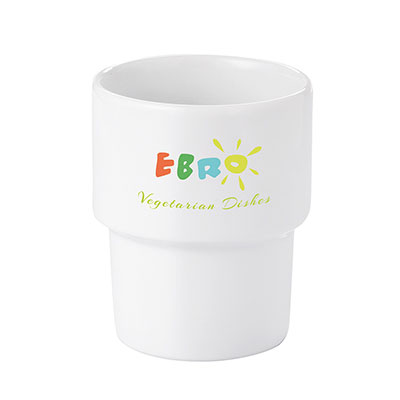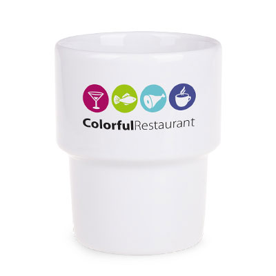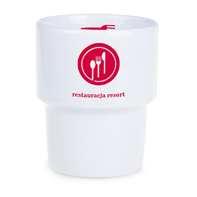 Średniej wielkości, porcelanowy kubek reklamowy bez uchwytu. Fason umożliwiającym sztaplowanie.
