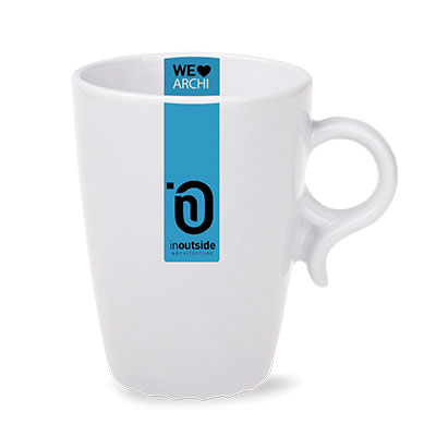 Zgrabny kubek reklamowy o niewielkich rozmiarach i charakterystycznym okrągłym uchwycie.