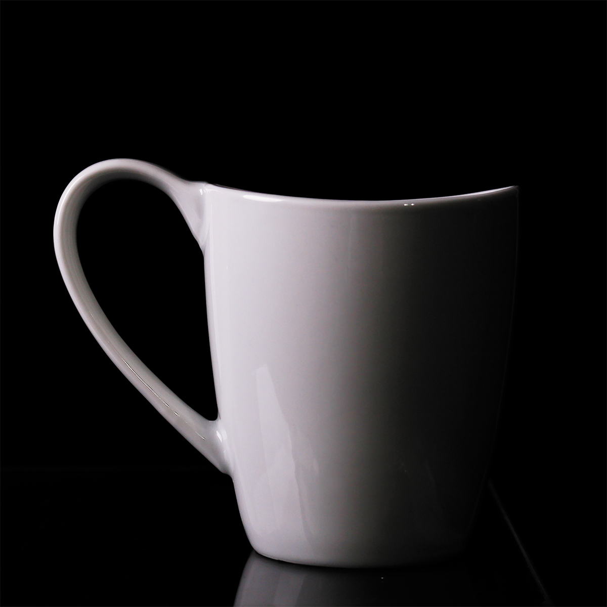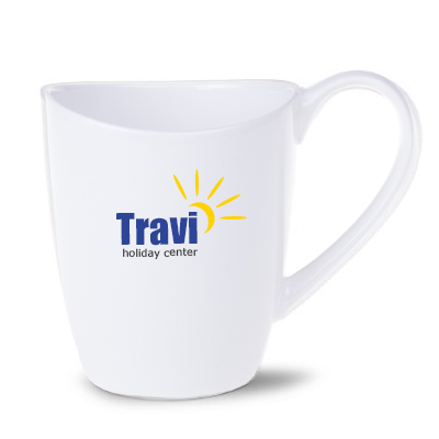Porcelanowy kubek z dużym uchwytem oraz delikatnie pofalowaną krawędzią rantu.
